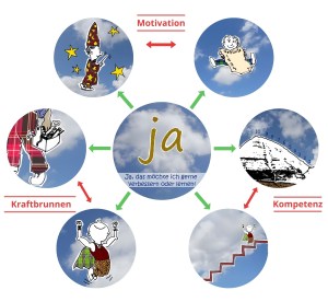 Die Skalierungskarte mit der Leiter wurde durch eine Karte mit eine Treppe (siehe Foto 1) ersetzt. Auf den einzelnen Stufen stehen keine Zahlen mehr. Manche Kinder und Jugendliche assoziierten diese nämlich mit (Schul-)Noten (bestanden, nicht bestanden). Mit der Skalierungsfrage soll, ohne Beurteilung, besprochen werden, was die Kinder und Jugendliche jetzt schon können und auf welches Ziel sie hinarbeiten möchten. Daher wurde auch die Abbildung der Stolz-Karte nicht ganz oben auf der Treppe platziert. So kann besprochen werden, was die einzelnen Schritte beinhalten und dass der Veränderungswunsch des Kindes/der*des Jugendlichen auf jeder Stufe in Ordnung ist.